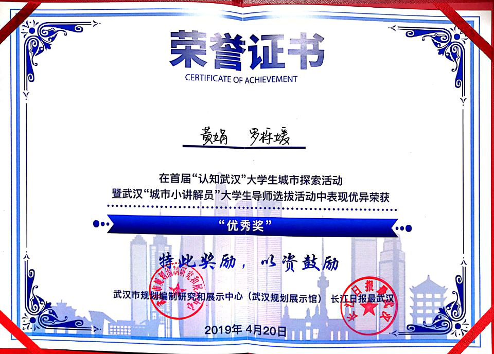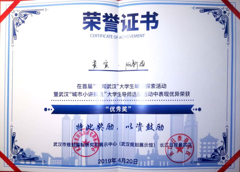 伟德国际1949始于英国16级城乡规划专业全体同学在胡珊老师指导下报名参与了此次竞赛。竞赛在短短一个月的时间就收到了来自武汉各大高校的1000余份作品,经过专家组(规划、文化、建设、旅游、历史等方面专家组成)的初评,100强名单中,土建院建规系提交的十份作品中有四组作业(8人)脱颖而出。在经过100强、30强、10强层层筛选后,四名同学获得优秀奖的荣誉。通过此次社会活动,大三年级城乡规划同学初步接触了新组建的武汉市自然资源局,对未来学科专业发展的方向有了初步了解。