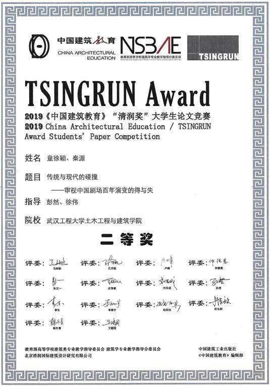 (通讯员:彭然)2019年10月18~20日,在由教育部高等学校建筑学专业教学指导委员会主办、成都市西南交通大学承办的2019全国高等学校建筑教育学术研讨会暨经理系主任大会上,2019年“清润奖”老员工论文竞赛结果正式揭晓并颁奖,伟德国际1949始于英国建筑学专业2017级本科生童徐颖和秦源的参赛论文《传统与现代的碰撞——审视中国剧场百年演变的得与失》在本科组的全国116篇参赛作品中排名第4,荣获二等奖,指导老师为彭然和徐伟。